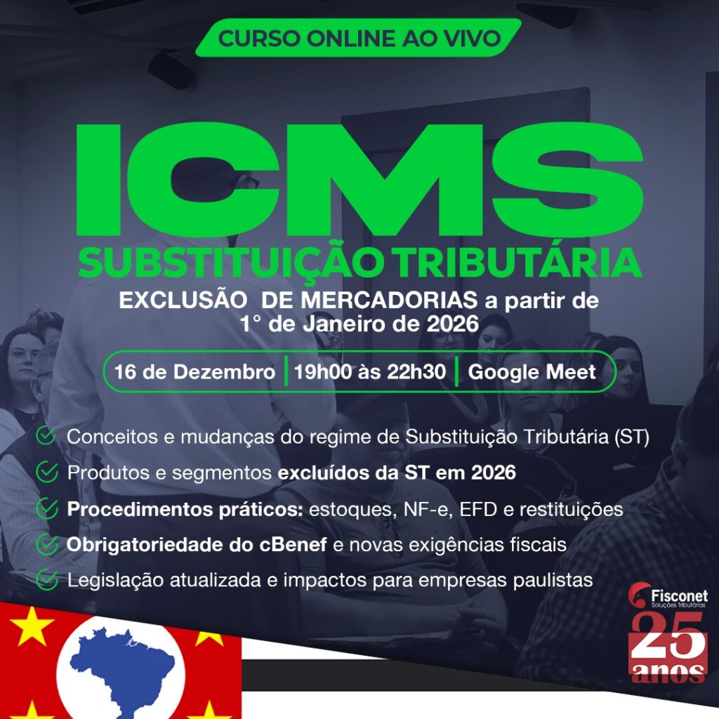 Com uma abordagem objetiva e aplicada à rotina fiscal, o Curso Prático de Exclusão de Mercadorias da Substituição Tributária foi desenvolvido para profissionais que precisam entender, na prática, como funcionará a retirada de diversos segmentos do regime de ICMS ST a partir de 1º de janeiro de 2026 — conforme Portaria SER nº 64/2025.