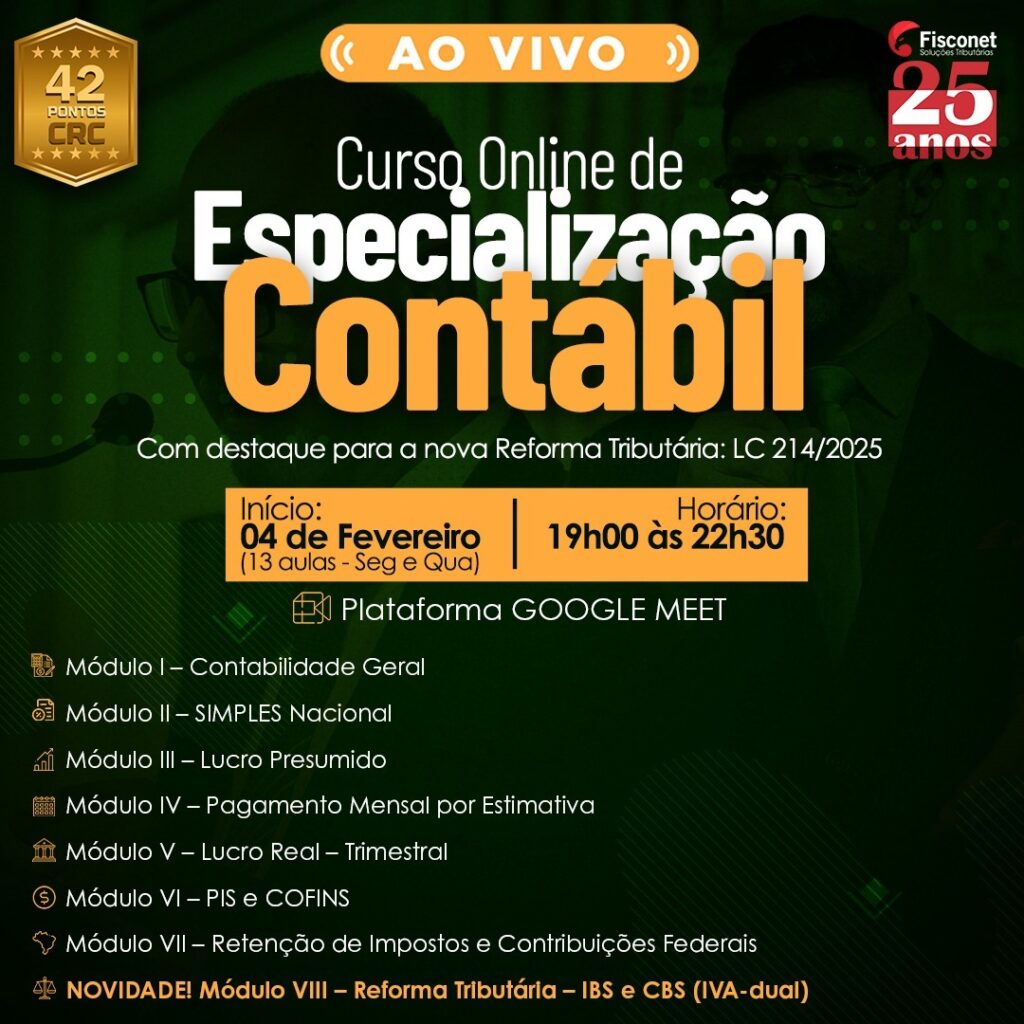 A Especialização Contábil Federal foi desenvolvida para quem deseja consolidar um conhecimento sólido em Contabilidade Geral e dominar os principais regimes tributários federais — Simples Nacional, Lucro Presumido, Lucro Real, Estimativa, PIS/COFINS, Retenções Federais e o novo IVA-dual (IBS/CBS).