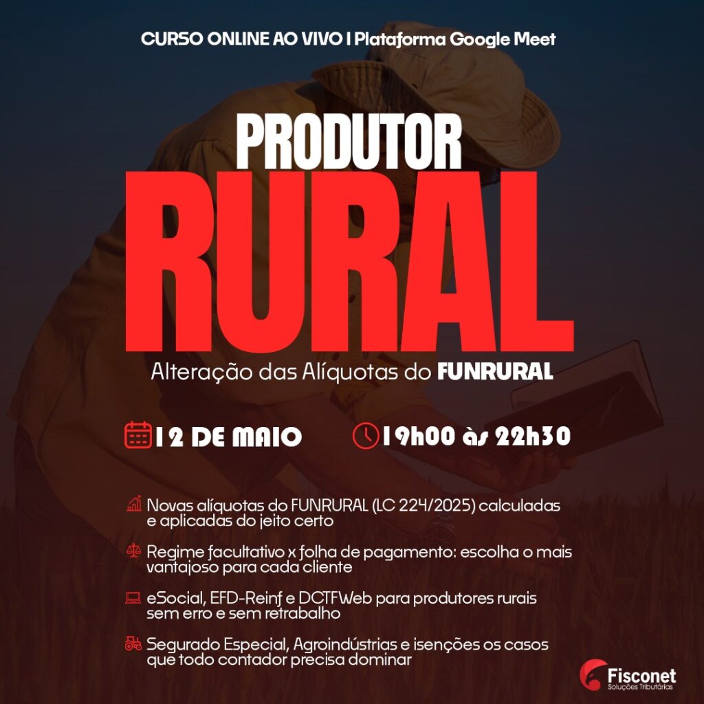 Neste curso, você aprende de forma prática e objetiva como aplicar as regras do produtor rural pessoa física e jurídica, compreender a tributação do FUNRURAL e realizar corretamente as informações no eSocial, EFD-Reinf e DCTFWeb.